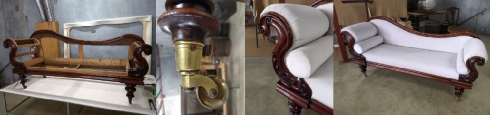 When given a restored antique chaise lounge frame to re-upholster the problem is that there may have been many different ways it was traditionally upholstered. Therefore the method of upholstery depends upon the client’s interpretation on how the furniture appeared originally combined with the restorer’s knowledge and research into period pertaining to this style of furniture.